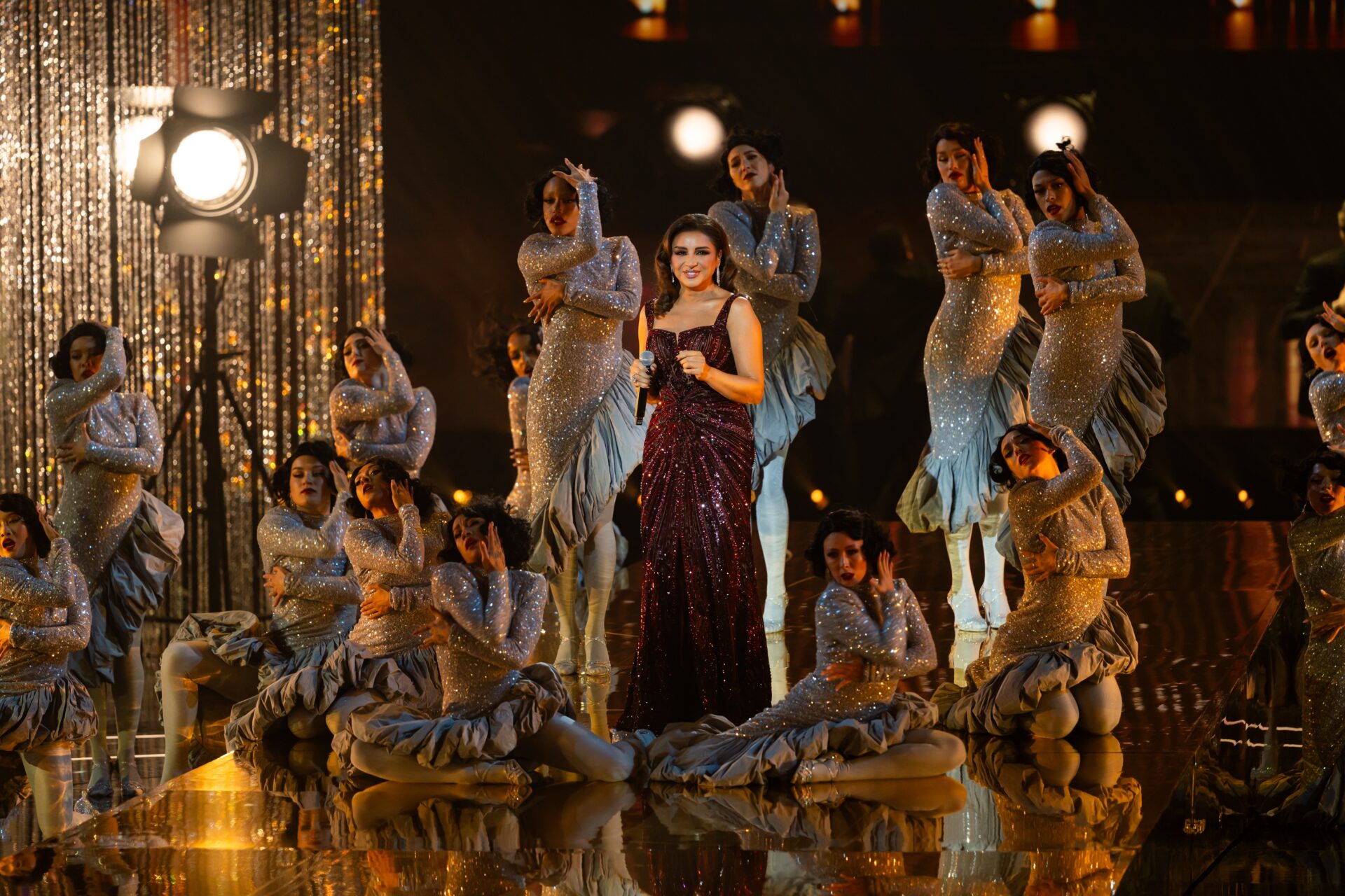 وعادت العروض الفنية للواجهة عبر فقرة غنائية كبيرة قدّمتها الفنانة أنغام بمشاركة عازف القيثارة البولندي “مارسين”، ضمن استعراض حي على المسرح تفاعل معه الحضور، قبل أن تستكمل الجوائز بتقديم محمد هنيدي لجائزة أفضل مسلسل خليجي، التي تنافست عليها أعمال “المرسى” و“أمي” و“شارع الأعشى” و“صيف 99”، وانتهت بفوز مسلسل “شارع الأعشى”، واستلام طاقم العمل للجائزة.