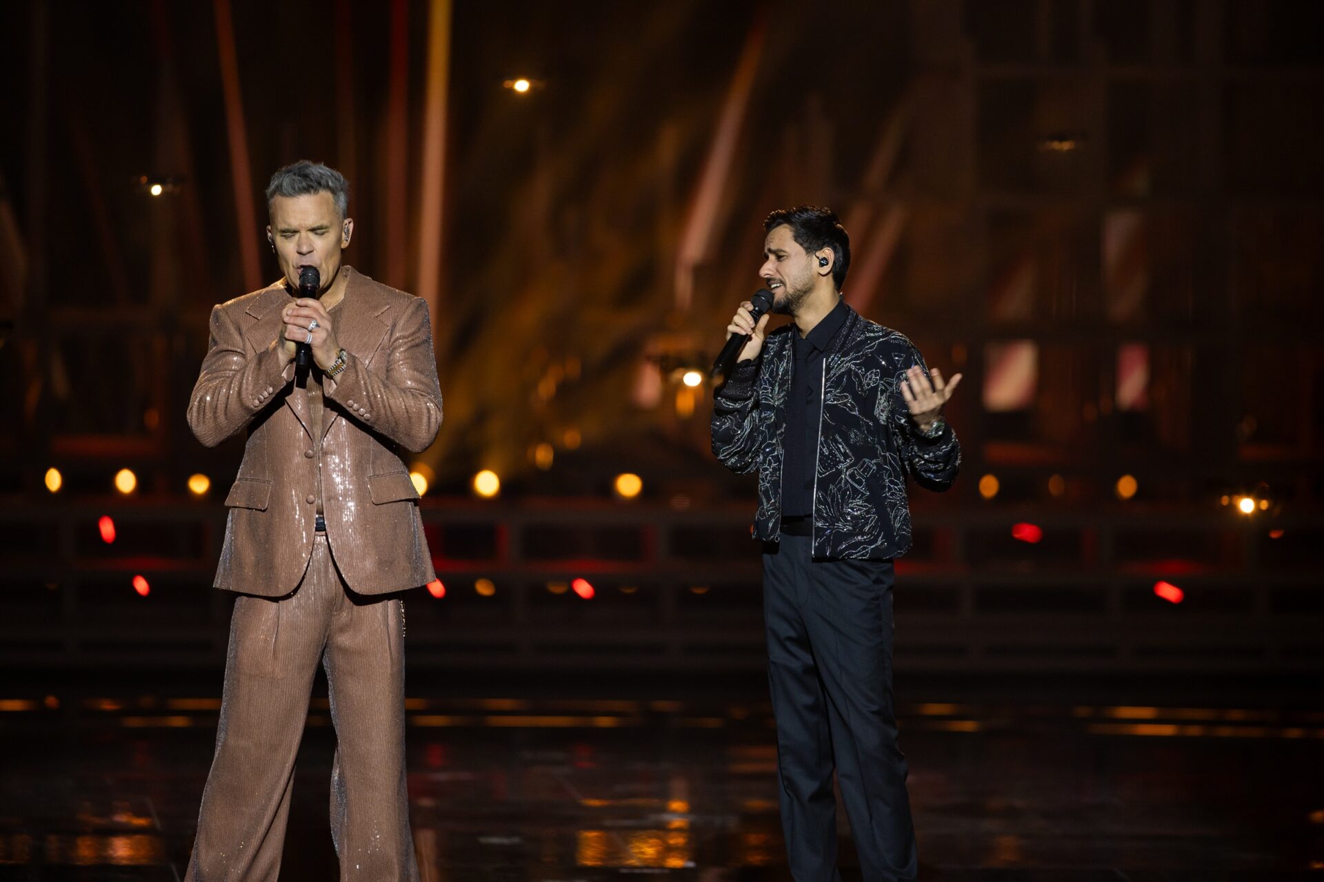 وتواصلت أجواء الأمسية بفقرة غنائية لافتة جمعت النجم العالمي روبي ويليامز والفنان عايض، حيث قدّم روبي ويليامز مجموعة من أشهر أعماله، من بينها “Feel”، فيما قدّم عايض أغنية “تخيّل لو” وسط تفاعل كبير من الحضور، قبل أن يلتقيا في دويتو مميز لأغنية “Angels” شكّل إحدى أبرز لحظات الحفل وأكثرها تفاعلاً.